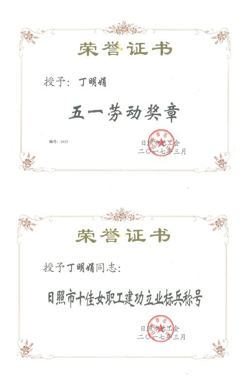 2017年3月,我公司財務總監丁明娟被日照市總工會授予“五一勞動獎章”、“日照市十佳女職工建功立業標兵”稱號