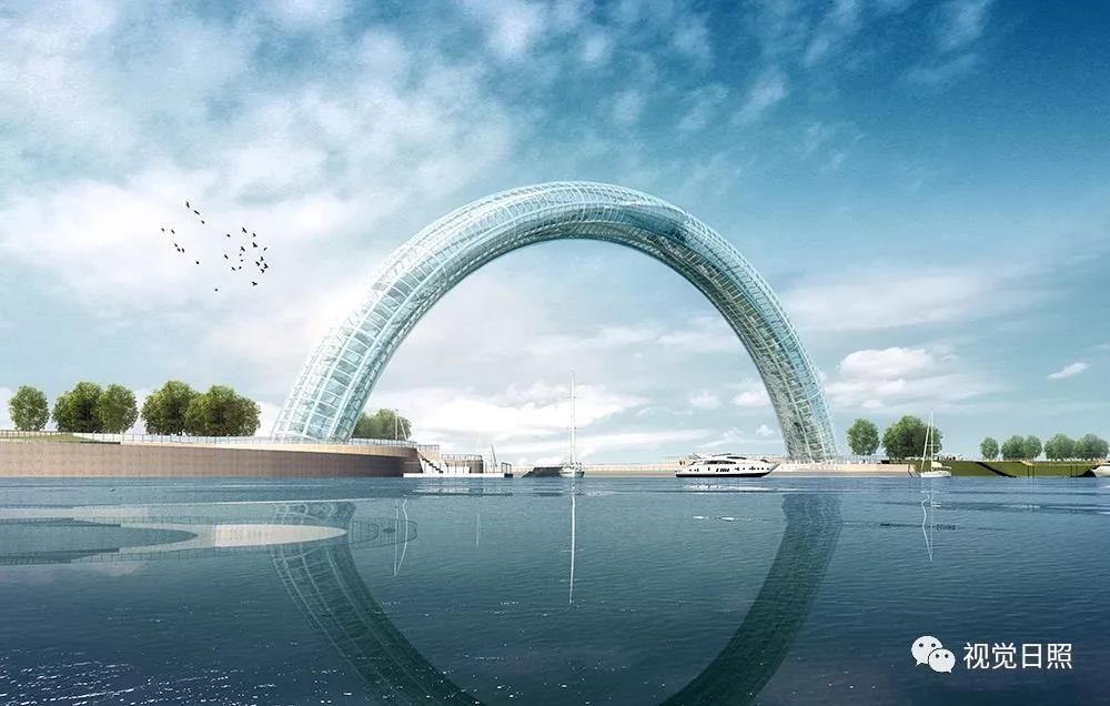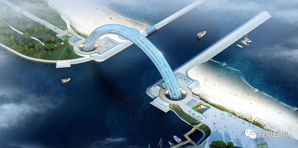 遠觀大橋,彩虹形橋體呼應“日出初光先照”之意,如一輪剛剛升起的紅日坐落在海平面上,在每天日出之時,橋體與自身倒影相映成趣,以初升之日點睛,形成壯美的巨目形象。